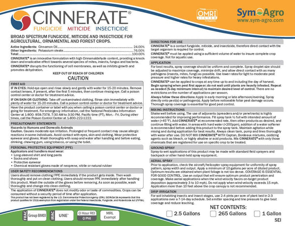 Sym-Agro Cinnerate is a fast acting knock down miticide & fungicide that goes to work immediately to stop disease, immobilize and kill mites, and other insects. The active ingredient is based on cinnamon aldehyde, emulsified with potassium oleate. The innovative formulation provides high levels of control with low application rates, and a high degree of crop safety.