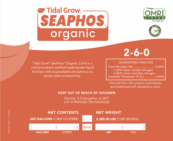 Tidal Grow® SeaPhos® contains 6 % P from cold processed, hydrolyzed fish bones.